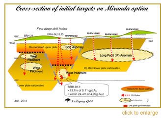 A respectable number of shallow drill holes (less than 450 feet in depth) have attractive gold intercepts at or near their bottom and there are several surface gold anomalies that have not yet been drilled. While there are few deeper holes drilled to date, several have significant intercepts, e.g. the 24.4m of 4.987g Au/t (80 ft of 0.146 oz Au/t) including 13.7m of 8.105g Au/t (45 ft of 0.237 oz Au/t) in lower-plate carbonate rocks on the Miranda portion of the Red Hill Prospect (illustrated below right) indicating the properties are capable of hosting potentially economic material.