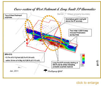 The IP results indicate a very large, probably favorable, sulphide zone just below the level of the previous shallow drilling, which holes have anomalous gold intercepts likely representing leakage from the deeper sulphide zone. Superimposing (figure to right) the classic north by northwest orientation of the existing gold deposits in the Cortez Segment over the IP anomalies shows that the West Pediment and the Long-Fault IP Anomaly are likely ‘spilling over’ into the Barrick and Wilson portions.